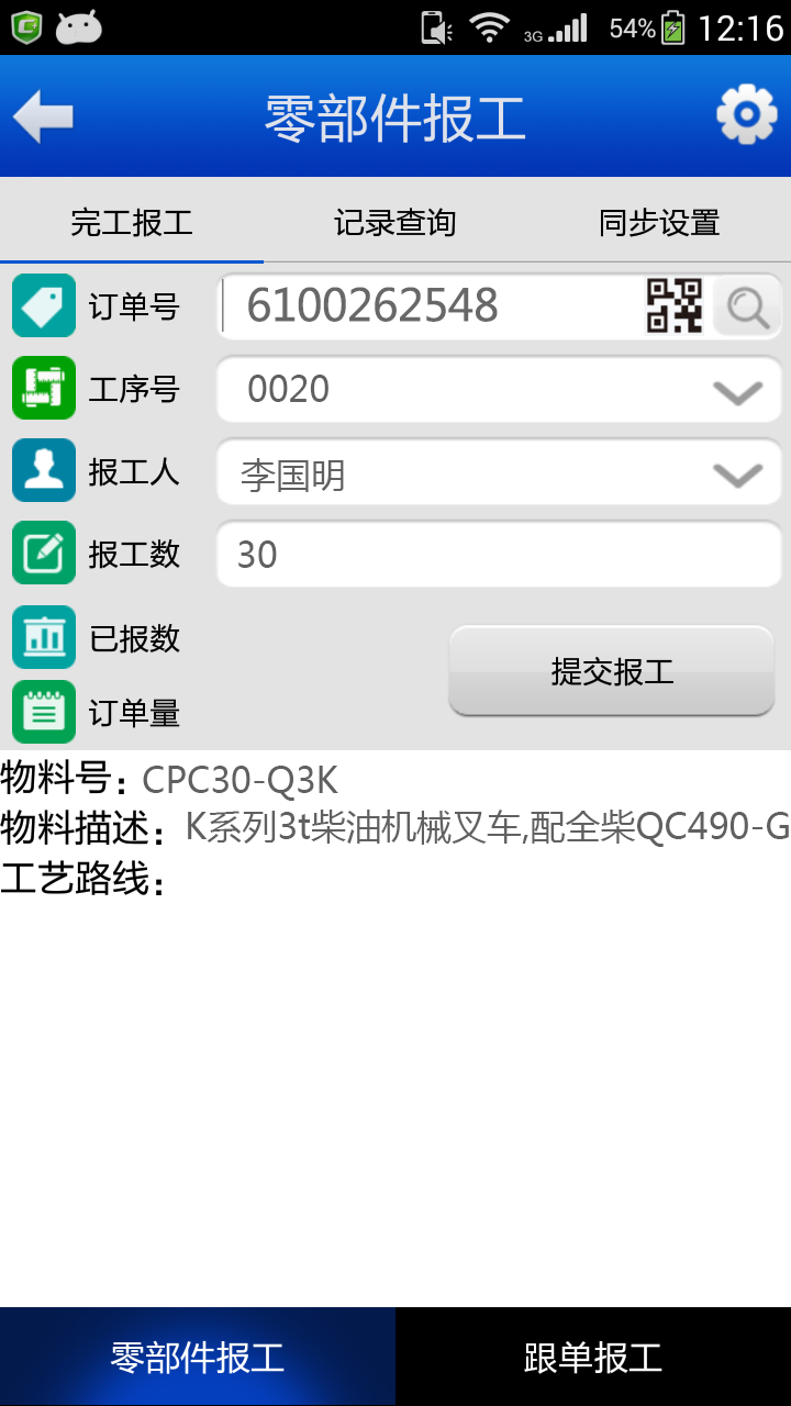 针对ERP生产任务,基于先进的手机扫码及图形识别技术,在生产现场对零部件及整车进行实时的报工数据采集,并将报工数据发送到ERP系统中;同时对数据进行智能分类统计。通过移动互联技术将繁杂的报工工作交由手机快速、准确、及时地完成,大大提高生产部门的工作效率,带来良好的经济效益和管理效益。